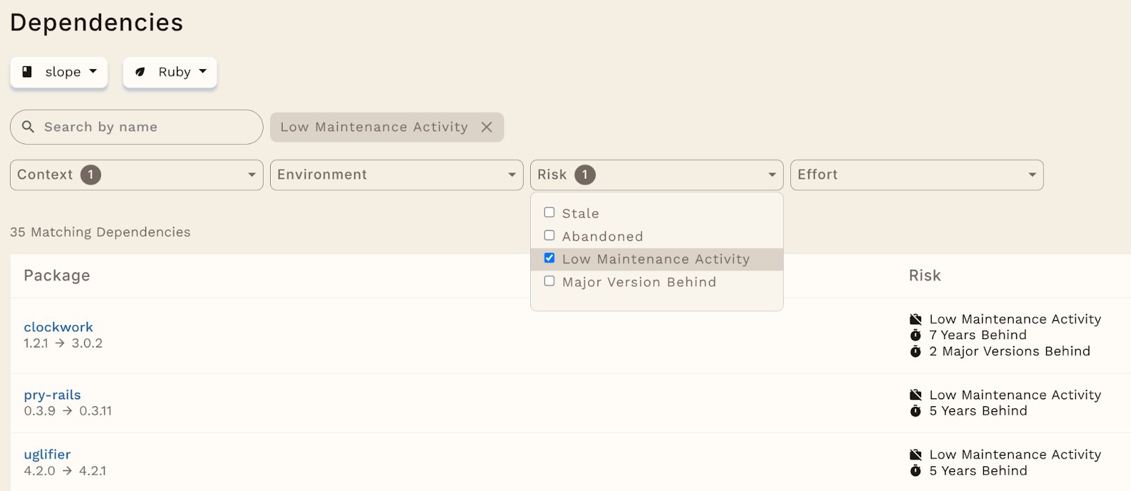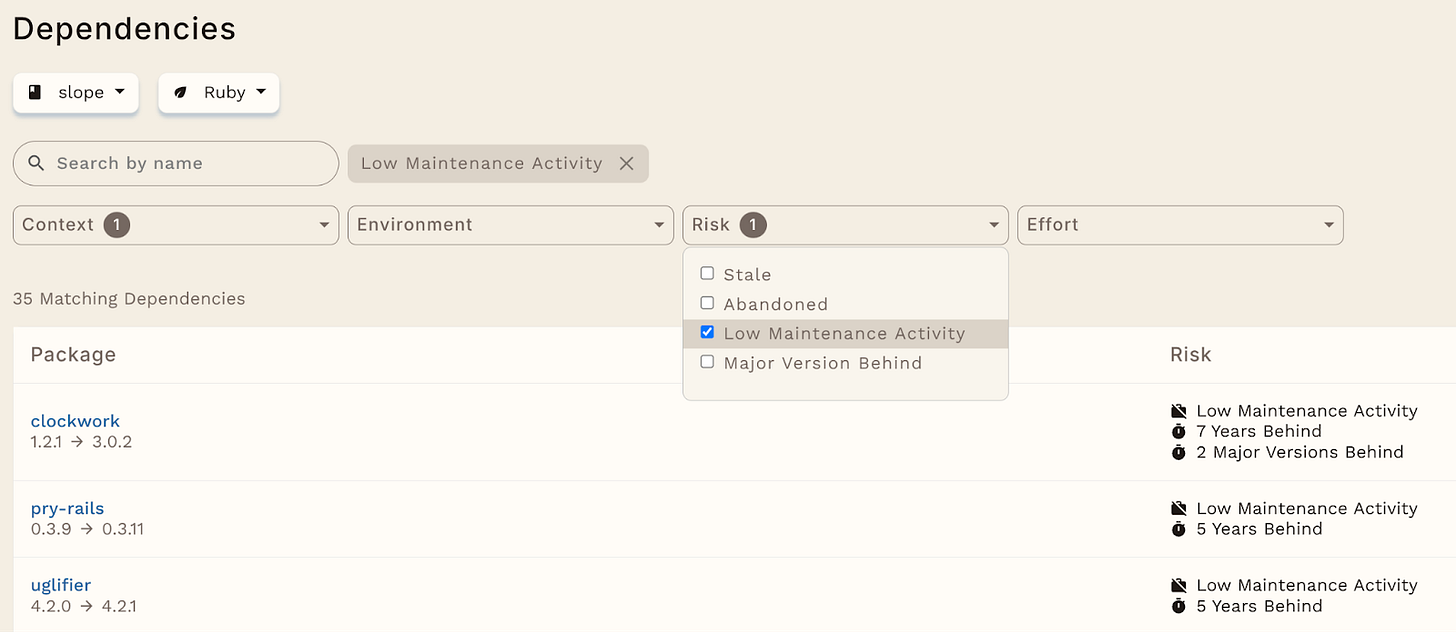 Infield detects abandoned dependencies using a combination of factors, including release cadence, commit history, maintainer comments, and community behavior. We’ve trained a model to combine these inputs to score the abandonment level of a dependency in order to predict dependencies that might be at risk. Our customers can then take action on these dependencies within their repos.